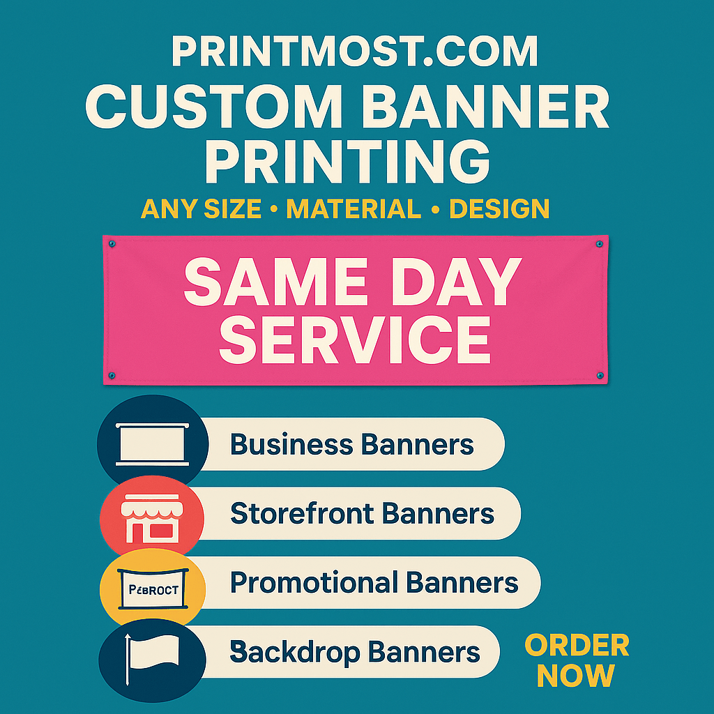 Make your message stand out with high-quality, full-color custom banners from Print Most. We offer durable vinyl, mesh, fabric, and retractable banners—perfect for business promotions, events, trade shows, storefronts, and more. Our Phoenix-based print shop delivers fast nationwide shipping and expert finishing options like grommets, hems, and pole pockets. Need help with design? We’ve got you covered.